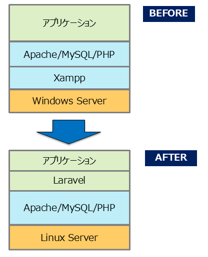 | 画像補足 | BEFORE ・Windows VPS最大スペックのため、ランニングコスト膨大 ・Xpmpp利用でセキュリティリスク+リソース効率× ・独自実装のためアプリメンテナンス性× AFTER ・ランニングコストの適正化 ・標準的構成によりコストダウン×メンテナンス性確保 |