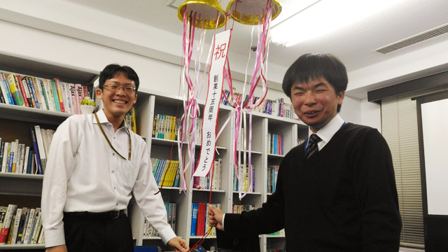今年2度目のくす玉はもちろん15周年仕様。Sさんさすがです!