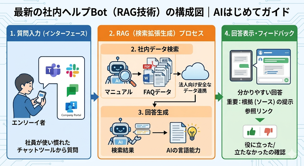 現在の社内ヘルプBotは、「RAG(検索拡張生成)」と呼ばれる技術を活用し、大きく次の3つの構成で作られています。